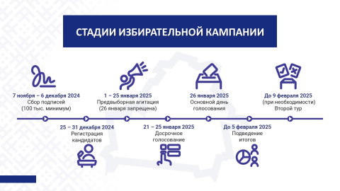 С 1 по 25 января 2025 г.будет проводиться предвыборная агитация, самый активный и ответственный этап избирательной кампании. В день голосования, 26 января, агитация запрещена законодательством.